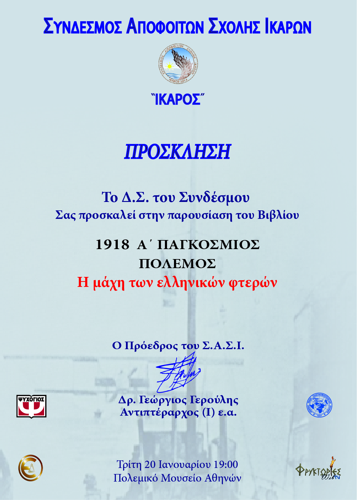 Στις 20 Ιανουαρίου 2026, και ώρα 7.00 μ.μ. θα γίνει βιβλιοπαρουσίαση στο Πολεμικό Μουσείο Αθηνών υπό την αιγίδα του Συνδέσμου Αποφοίτων Σχολής Ικάρων (Σ.Α.Σ.Ι), του έργου “1918 Α΄ Παγκόσμιος Πόλεμος. Η μάχη των ελληνικών φτερών”,